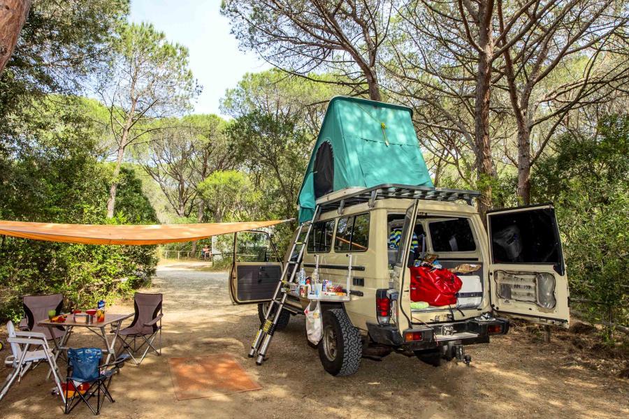 Der Campingplatz liegt in einem Pinienwald, direkt am Meer, in der Nähe zu einem Sandstrand und verfügt über ein reiches Unterholz. Die Gesamtfläche beträgt 300.000 Quadratmeter, die Zahl der Plätze ist auf 370 begrenzt, 39 Holzhütten mit jedem Komfo