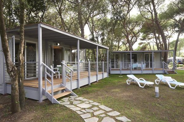 Caravan Rossini, the modern housing solution for lovers of outdoor holidays. The caravans are equipped with a large veranda, a stainless steel kitchen, a comfortable table with outdoor chairs.