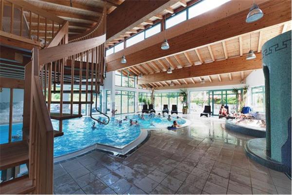 Indoor swimming pool with jet stream, waterfall, massage bench and floor jets, kiddie pool, free admission to the swimming-camping pine grove, fitness room, Finnish sauna, Jacuzzi, Turkish steam bath, solarium, table tennis, volleyball. Free ski bus. 4 rental caravans, private Family bathrooms.