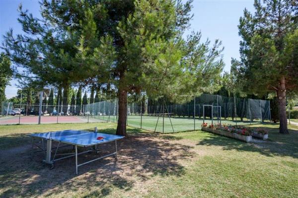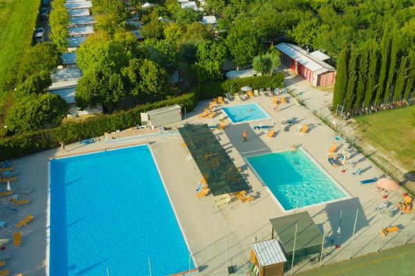 Onze rustige en schaduwrijke camping ligt op 150 meter van de zee en 1,8 Km. van het oude stadcentrum. De camping is uitgerust met bar, restaurant, snackbar, pizzeria, mini-market, rookwarenwinkel, krantenkiosk. Op de camping, die zich op een grasterrein van 45.000 m2 bevindt, vindt u een speelzaal, een speeltuin, animatie, sport, ontspanning in de avonduren, dansvloer,filmzaal, e.h.b.o. een babyverzorgingsuimte, muntenwasmachines, stomerij, douche met hydromassage, eucharistieviering op feestdagen, en parkeerplaatsen, zowel op als buiten de camping. Er is keuze tussen een gratis toegankelijk strand en een privé-strand (met strandstoelen tegen betaling - geen speciale overeenkomst). Zandstrand met laag water, ideaal voor kinderen. Op de camping zelf zijn 3 sanitairruimtes met gratis warm water in de douches, wastafels en spoelbakken. Bungalows met 2 tot 7 slaapplaatsen, keuken en badkamer, warm water uit boiler van 10 liter. Huisdieren zijn niet toegestaan in de bungalows. De sportaccomodabie bestaat uit 3 zwembaden (semi-olympisch 25x12, middelgroot bad 12x18 en kinderbad 6x6), tennisveld, mini-voetbal, mini basket, volleybal, jeu de boules en pingpongtafel. In het middelgrote zwembad kunt u gratis Acqua Gym lessen volgen. De toegang tot de sportaccomodabie, met inbegrip van de zwembaden, is kostenloos.